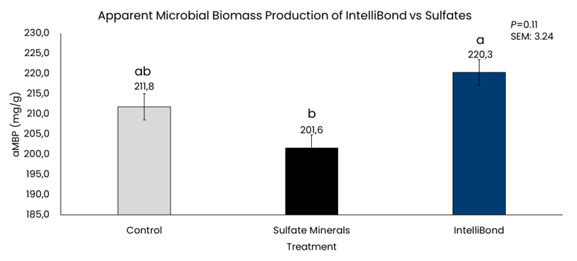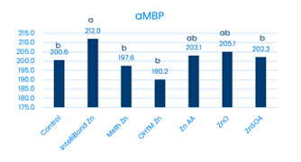 Recent onderzoek van Fermentrics Technologies, Inc. heeft de superieure prestaties aangetoond van IntelliBond-bronnen van zink en mangaan bij het bevorderen van de schijnbare microbiële biomassaproductie (aMBP), een belangrijke indicator voor de gezondheid en efficiëntie van de pens (Figuur 1). Eerdere studies toonden aan dat het vervangen van zinksulfaat door IntelliBond Z bij 90 ppm de productie van vluchtige vetzuren - een essentiële energiebron voor melkkoeien -verbeterde van 62 mM naar 90 mM.
