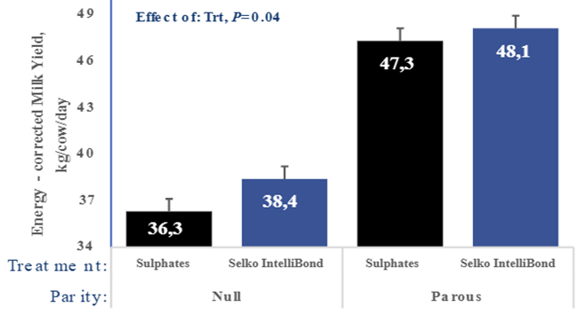 Wat betreft de verteerbaarheid presteren hydroxy-sporenelementen consequent beter dan hun anorganische tegenhangers. In een meta-analyse van 10 studies verhoogde de overstap naar hydroxy-bronnen de verteerbaarheid van neutrale detergentvezel (NDF) met 3 tot 4 procentpunten. Volgens onderzoek van de Michigan State University kan elke toename van 1% in NDF-verteerbaarheid zich vertalen in 250 gram meer 4% vetgecorrigeerde melk per koe per dag. Dit betekent tot extra kilogram melk per dag tijdens de overgangsfase en de piek van de lactatie, simpelweg door de mineralenbron te veranderen. Dit werd bevestigd in de laatste bevindingen van professor Jose Santos van de Universiteit van Florida, waar zijn onderzoeksgroep constateerde dat de gemiddelde energiegecorrigeerde melkproductie (ECM) over een periode van 105 dagen ongeveer 1,5 kg hoger per dag was in de groep die Selko IntelliBond kreeg toegediend (Figuur 2).