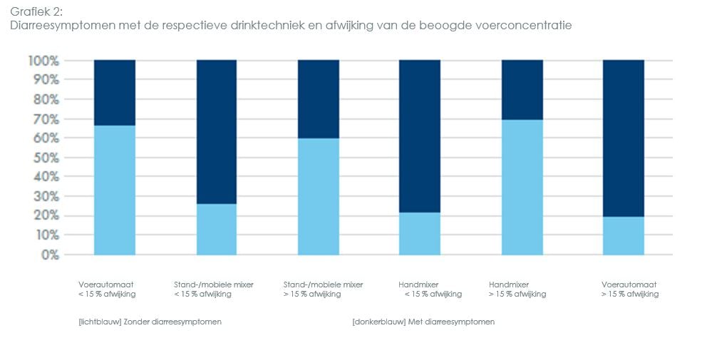 Van de 30 boerderijen die doseren met behulp van een weegschaal, hadden slechts 3 boerderijen vroege diarreesymptomen. Uit 25 boerderijen waarbij een weegschaal en mengtafels worden gebruikt, ervaarde geen enkele onder hen vroege diarreesymptomen. Uit de 51 boerderijen die via volume doseren, hadden 34 boerderijen vroege diarreesymptomen. Uit de 17 ad libitum-boerderijen hadden er, volgens hun eigen informatie, 16 boerderijen diarreesymptomen.