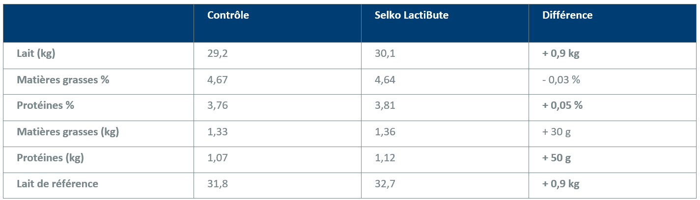 Les résultats ne sont pas surprenants et correspondent à ceux d’études internationales qui ont également montré une moyenne de 0,9 kg de lait de référence par vache et par jour. Cette hausse résulte d’une meilleure santé intestinale, qui semble également jouer un rôle au milieu et à la fin de la lactation. En plus d’améliorer le bilan alimentaire, l’augmentation de la production de lait grâce à Selko LactiBute a aussi des effets positifs sur la santé : démarrage plus facile, amélioration de la fertilité et réduction des troubles locomoteurs.