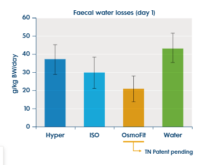 Sommige elektrolytoplossingen hebben een osmolaliteit van wel 400 tot 600 mOsm/kg. Deze hogere niveaus (hypertone oplossingen) deze trekken nog meer water uit het bloed naar het lumen van de darm. Trouw Nutrition onderzoek laat zien dat Sprayfo OsmoFit, een hypotone oplossing die per 60 gram wordt verstrekt, het waterverlies via de mest op de 1e dag van diarree aanzienlijk verbetert dan puur alleen water verstrekken. Ook in vergelijking met elektrolyten die een isotone of hypertone oplossing aanbieden, levert OsmoFit betere prestaties.