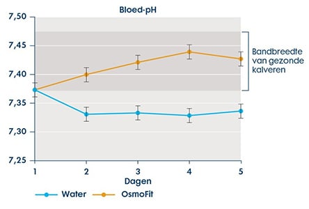 Onderzoek van Trouw Nutrition laat zien (grafiek 1) dat Sprayfo OsmoFit, een nieuwe elektrolyt zonder bicarbonaat, zeer goed in staat is om de juiste bloed-pH te handhaven en/of te herstellen.