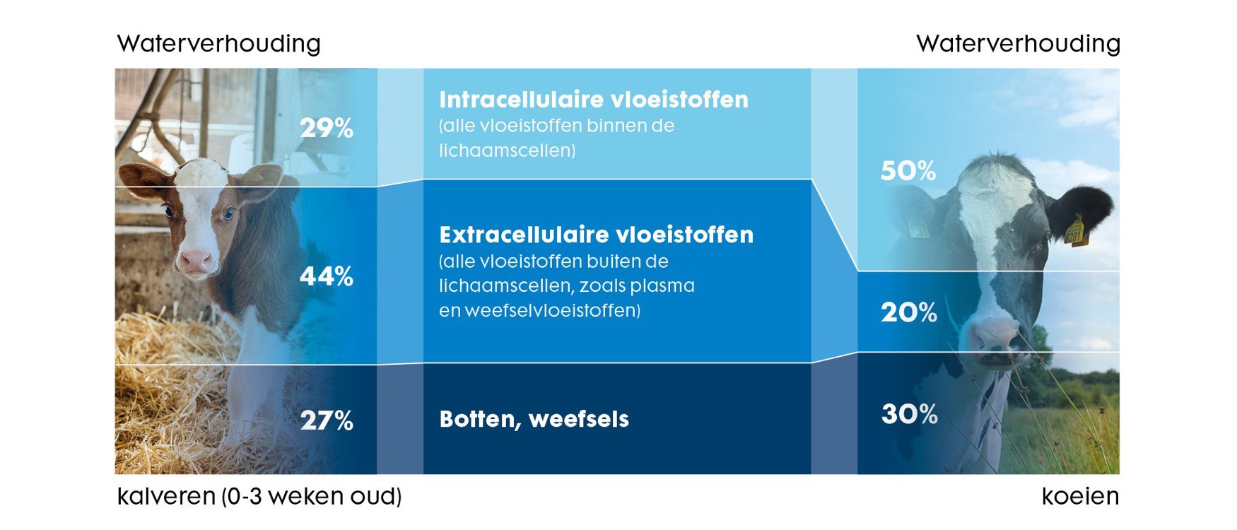 De vochtbalans wordt bepaald door wateropname en -afvoer (bv. urine) en door de waterverhouding binnen (intracellulair) en buiten (extracellulair) de lichaamscellen. Deze waterverhouding is bij het kalf fundamenteel anders opgebouwd dan bij de melkkoe. Een verstoring van de vochtbalans bij het kalf leidt daardoor tot een veel grotere uitdaging dan bij de koe. Niet voor niets is uitdroging als gevolg van diarree de meest voorkomende doodsoorzaak bij jonge kalveren.