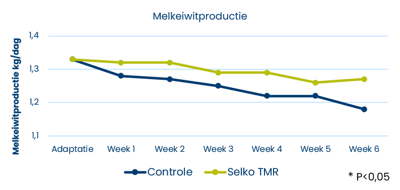 Een recent Nederlands onderzoek tijdens de zomermaanden (met temperaturen tussen 20 en 35°C) toont aan dat Selko-TMR een positief effect heeft op melkproductie. Hoewel de voeropname niet significant veranderde, produceerden koeien die Selko-TMR kregen maar liefst 1,7 kg méér melk per dag – een winst die je direct in de tank ziet!