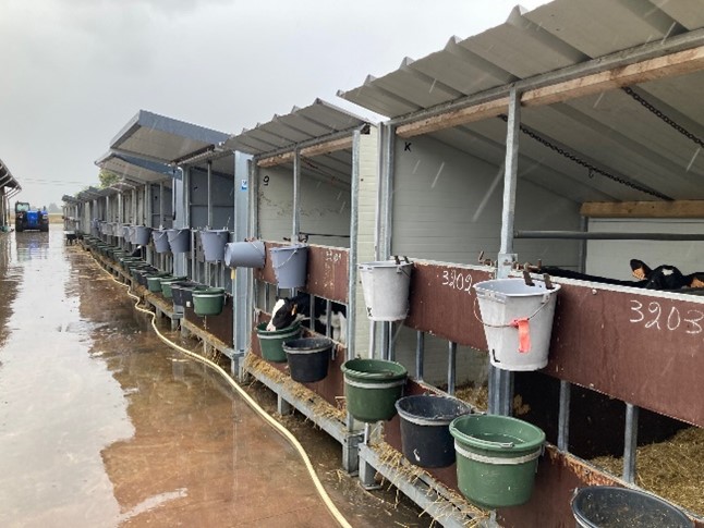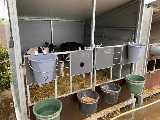 De geïsoleerde boxen staan zo’n 20 centimeter van de grond en de kalfjes liggen dik in het stro. Het tussenschot kan worden weggehaald zodat na een aantal weken de kalfjes per twee zitten.