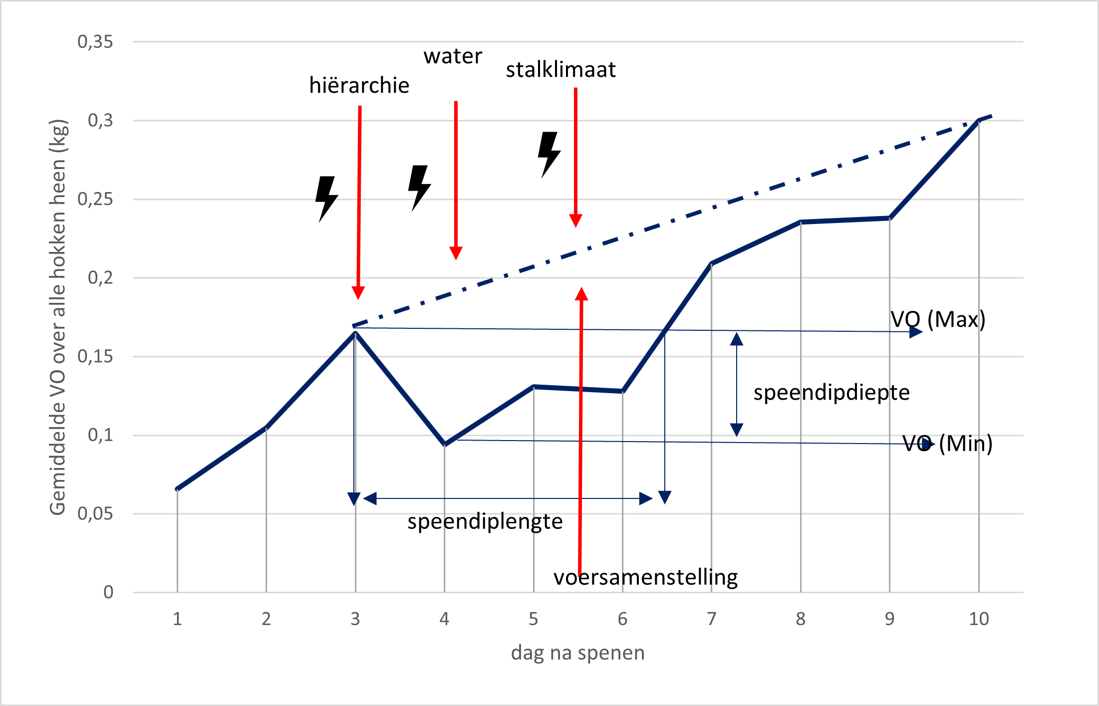 Een geleidelijke en voorspelbare voeropname zal ervoor zorgen dat de big zijn maximale groeipotentieel kan bereiken. De speendip meetbaar maken laat toe om de invloed van bepaalde strategieën te gaan evalueren. Wanneer we de gemiddelde voeropname over de hokken heen uit figuur 1 in kaart brengen dan zien we dat de dip vrijwel onmiddellijk optreedt na spenen (figuur 2). Gemiddeld duurt de dip 2 à 3 dagen. Vaak is dit ook het moment waarop antibiotica ingezet wordt om de big te ondersteunen. Interventies die een grote dip vermijden, zowel in de lengte als in de diepte, zullen het risico op overeten reduceren en garanderen een vlotte overgang na spenen.