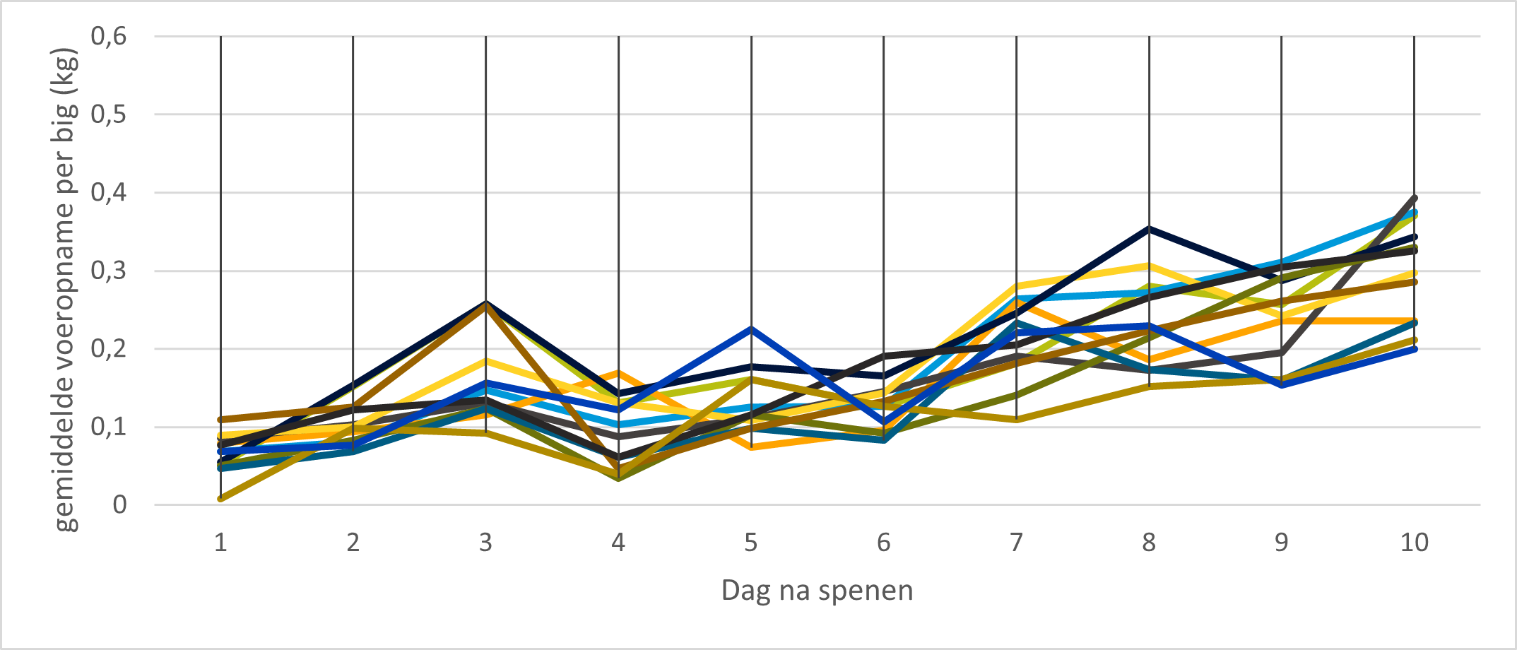 Het in kaart brengen van de voeropname na het spenen is niet eenvoudig en vergt heel wat inspanningen en technische knowhow. Er zijn dan ook weinig studies die hierin een accuraat inzicht geven. Wanneer we de gemiddelde voeropname in kilo per big van 12 verschillende hokken uitdrukken gedurende de eerste 10 dagen na spenen, dan zien we dat deze voeropname heel variabel is (figuur 1).