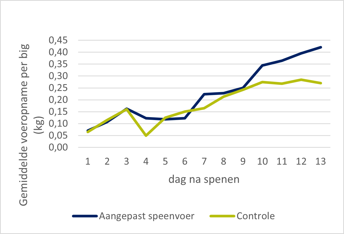 Daarom is het van belang dat de big voor het spenen voldoende voer opneemt. Anderzijds zorgt overeten voor een te hoog aandeel onverteerd eiwit in de dikke darm, met speendiarree tot gevolg. Het is dus zoeken naar een ideale voeropname.