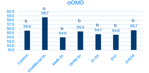 Recent onderzoek van Fermentrics Technologies, Inc. heeft de superieure prestaties aangetoond van IntelliBond-bronnen van zink en mangaan bij het bevorderen van de schijnbare microbiële biomassaproductie (aMBP), een belangrijke indicator voor de gezondheid en efficiëntie van de pens (Figuur 1). Eerdere studies toonden aan dat het vervangen van zinksulfaat door IntelliBond Z bij 90 ppm de productie van vluchtige vetzuren - een essentiële energiebron voor melkkoeien -verbeterde van 62 mM naar 90 mM.