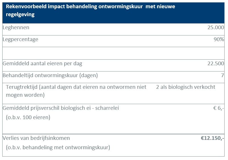 Deze wetswijziging heeft grote financiële gevolgen voor de biologische legsector. De negatieve impact op het bedrijfsinkomen van een biologisch leghennenbedrijf met 25.000 dieren kan zelfs oplopen tot € 12.150,- per ontwormingskuur*, waarbij per leghenbedrijf rekening moet worden gehouden met gemiddeld 6,5 ontwormingskuren per jaar.