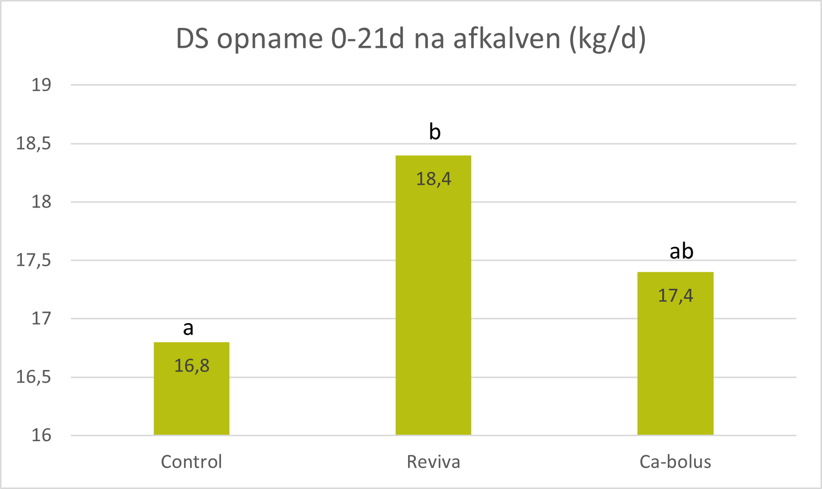 Figuur 2. Gemiddelde drogestof opname eerste 21 dagen na afkalven. Drie groepen: vrijwillige opname Reviva, orale calciumbolus (Ca-bolus) en controlegroep (Control).
