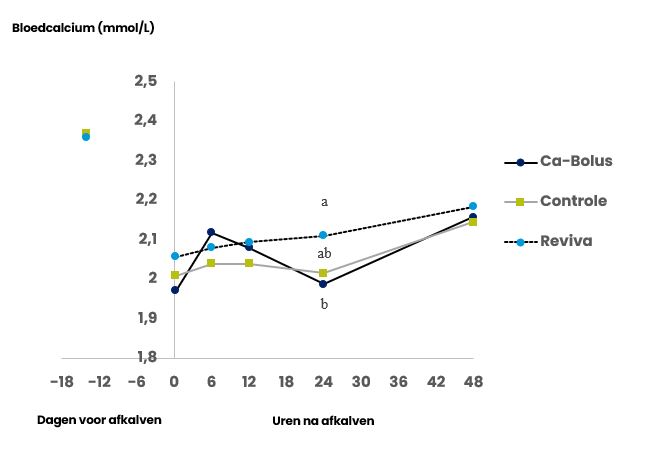 Om deze theorie te staven, voerde Trouw Nutrition een onderzoek uit naar het calciumniveau dat door een bolus en door een koedrank werd bereikt. Dit onderzoek is recent gepubliceerd (Wilms et al., 2022). Resultaten laten zien dat de calciumbolus zorgde voor een snelle stijging van het calciumniveau in bloed (na 6u), maar daarna weer daalde tot 24u na afkalven. Het calciumniveau met koedrank Reviva bleef echter na 6u ook voldoende hoog en zelfs licht stijgen gedurende de eerste 48u.