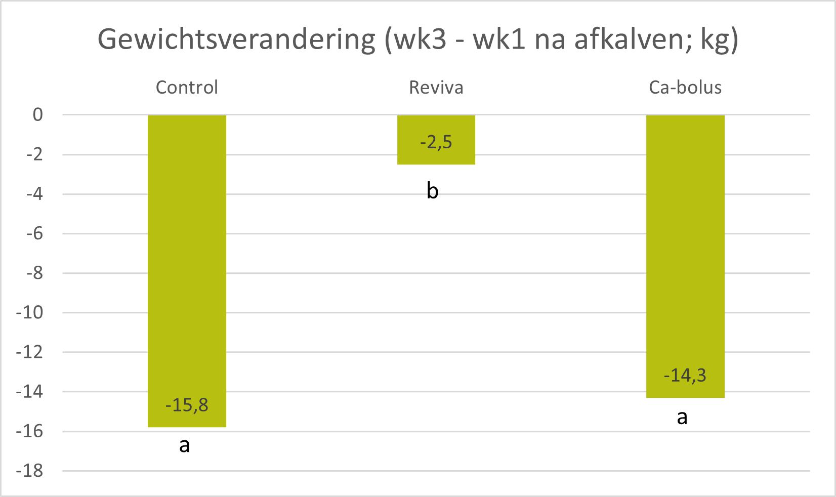Figuur 3. Gemiddelde gewichtsverandering tussen week 1 en 3 na afkalven. Drie groepen: vrijwillige opname Reviva, orale calciumbolus (Ca-bolus) en controlegroep (Control).