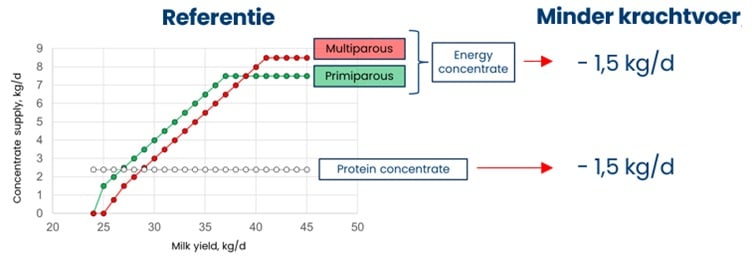 In een tweede studie werden lagere RE-niveaus in het rantsoen gerealiseerd door minder krachtvoer aan te bieden. In deze studie kregen 60 melkkoeien gedurende 8 weken twee verschillende krachtvoerschema's naast een PMR-rantsoen. Hierbij werd voor zowel de eiwit- als de energiebrok 1,5 kg/koe minder aangeboden, zoals te zien is in figuur 1. Met deze aanpassing in krachtvoerverstrekking daalde het ruw eiwitgehalte van 15,5% naar 14,4%.