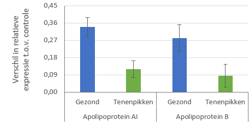 Apolipoprotein A1 en B zijn twee eiwitten in het bloed van de kip die een rol spelen bij het transport en de opname van vet. Deze eiwitten worden onder andere in de lever gemaakt en na afgifte in het bloed transporteren ze vetzuren naar perifere weefsels zoals de huid. De expressie van beide genen was in de lever van getenenpikte witte hennen lager dan bij gezonde witte hennen (zie figuur 2).