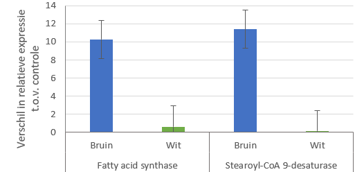 Het vergelijken van de genexpressie tussen witte en bruine hennen laat zien dat ze hun vetmetabolisme anders aansturen. Zo blijkt de expressie van de genen die verantwoordelijk zijn voor de synthese van de enzymen ‘fatty acid synthase’ en ‘stearoyl-CoA 9-desaturase’ bij bruine hennen veel hoger dan bij witte hennen (zie figuur 1). Het enzym ‘Fatty acid synthase’ zorgt ervoor dat suikers omgezet worden in palmitaat (een bouwsteen voor onverzadigde vetzuren) en het enzym ‘stearoyl-CoA 9-desaturase’ vormt uit het verzadigde palmitaat onverzadigde functionele vetzuren.