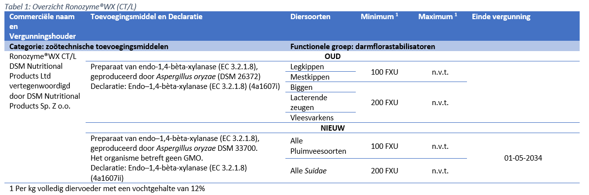 Trouw Nutrition Benelux zal uiterlijk per 1 november 2024 de voormengsels en aanvullende voeders voor genoemde diersoorten met Ronozyme®WX (CT/L) etiketteren volgens de nieuwe regels. Zodra de voormengsels met de nieuwe declaratie worden verwerkt in