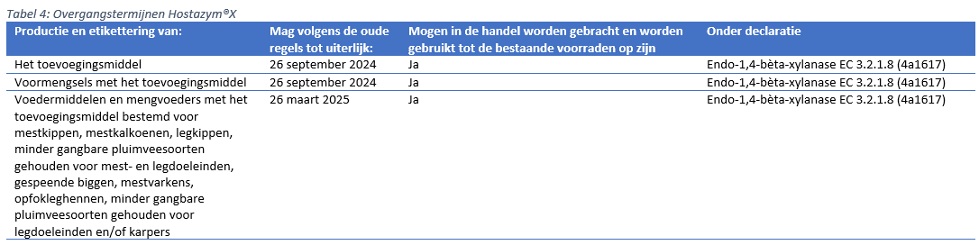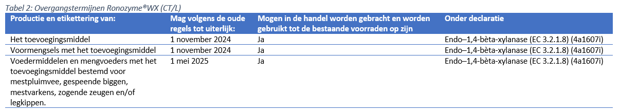 Zie Tabel 2 voor de geldende overgangsdata voor de productie en etikettering, het in de handel brengen en het opmaken van bestaande voorraden voor endo-1,4-bèta-xylanase (EC 3.2.1.8), geproduceerd door Aspergillus oryzae (DSM 26372) bestemd voor mestpluimvee, gespeende biggen, mestvarkens, zogende zeugen en/of legkippen.