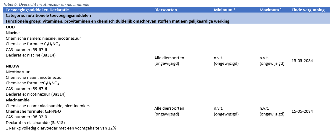 - De voorwaarden van gebruik van nicotinezuur en niacinamide zijn niet gewijzigd (zie Tabel 6 voor overzicht).