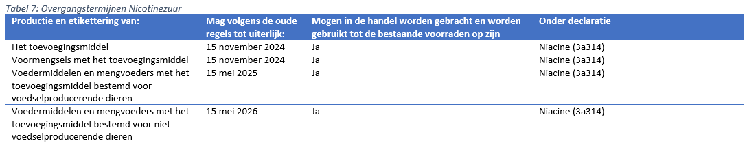 Zie Tabel 7 voor de geldende overgangsdata voor de productie en etikettering, het in de handel brengen en het opmaken van bestaande voorraden nicotinezuur.
