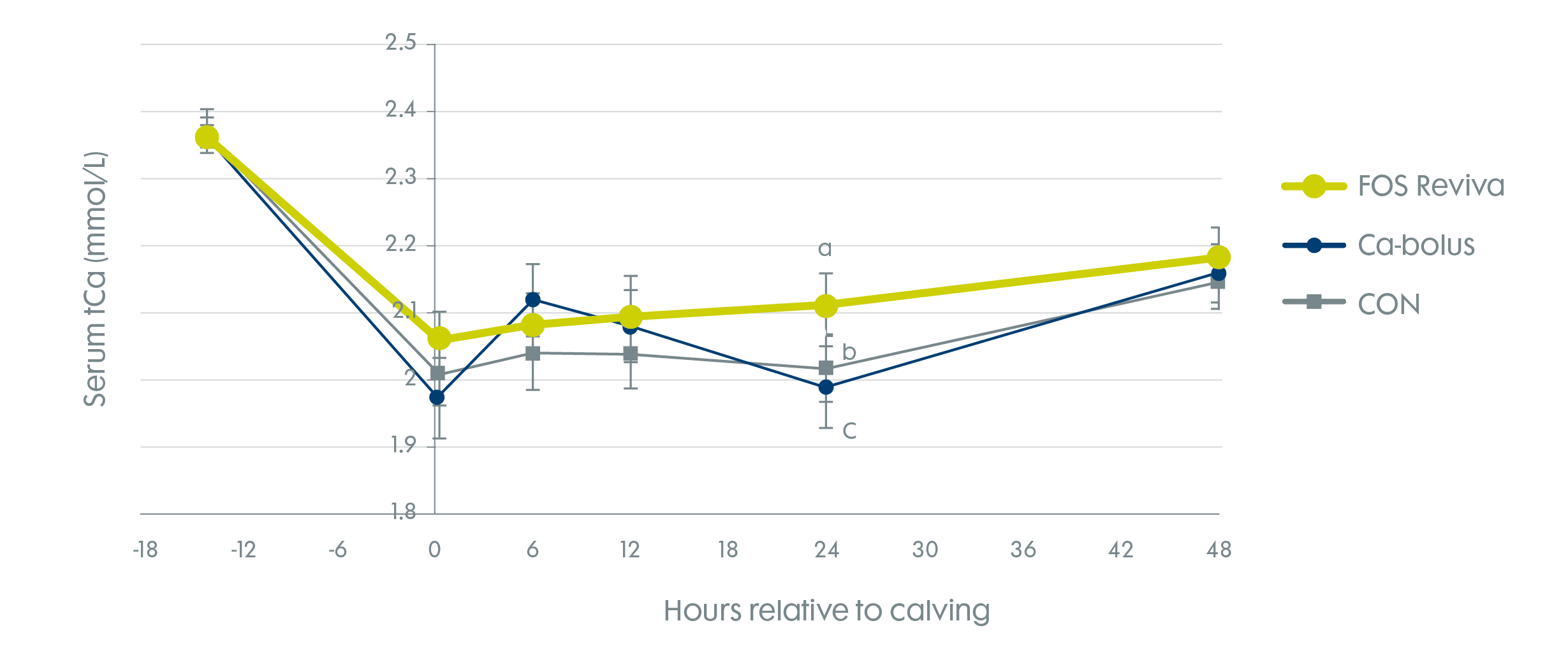 Deze grafiek vergelijkt het gebruik van een calciumbolus (Ca-Bolus), Farm-O-San Reviva en een controlegroep (CON) na de geboorte. Bij de bolus is duidelijk te zien dat het calciumgehalte in het bloed het snelst stijgt, maar ook na 24 uur tot het laagste niveau daalt. Dit betekent dat, hoewel de bolus zeer snel inwerkt, de koeien na 24 uur weer in een "calciumdip" terechtkomen. Met Farm-O-San Reviva neemt het calciumgehalte gelijkmatig toe en bereikt het na 24 uur het hoogste calciumgehalte, dat 48 uur na de geboorte op het hoogste niveau blijft.