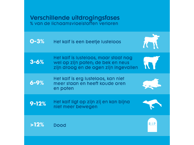 Diarree bij kalveren veroorzaakt een daling van de melkopname en een verlies aan elektrolyten en vocht. Hierdoor wordt de groei vertraagd en zware gevallen van diarree veroorzaken zelfs ernstige uitdroging, welke dodelijk kan zijn voor het kalf. Uitdroging wordt uitgedrukt in het percentage lichaamsgewicht dat in de vorm van water is verloren.
